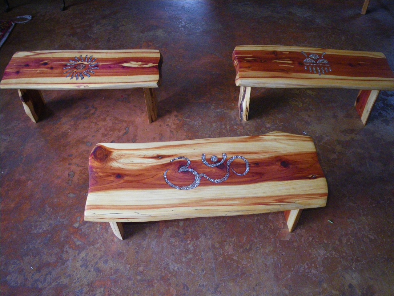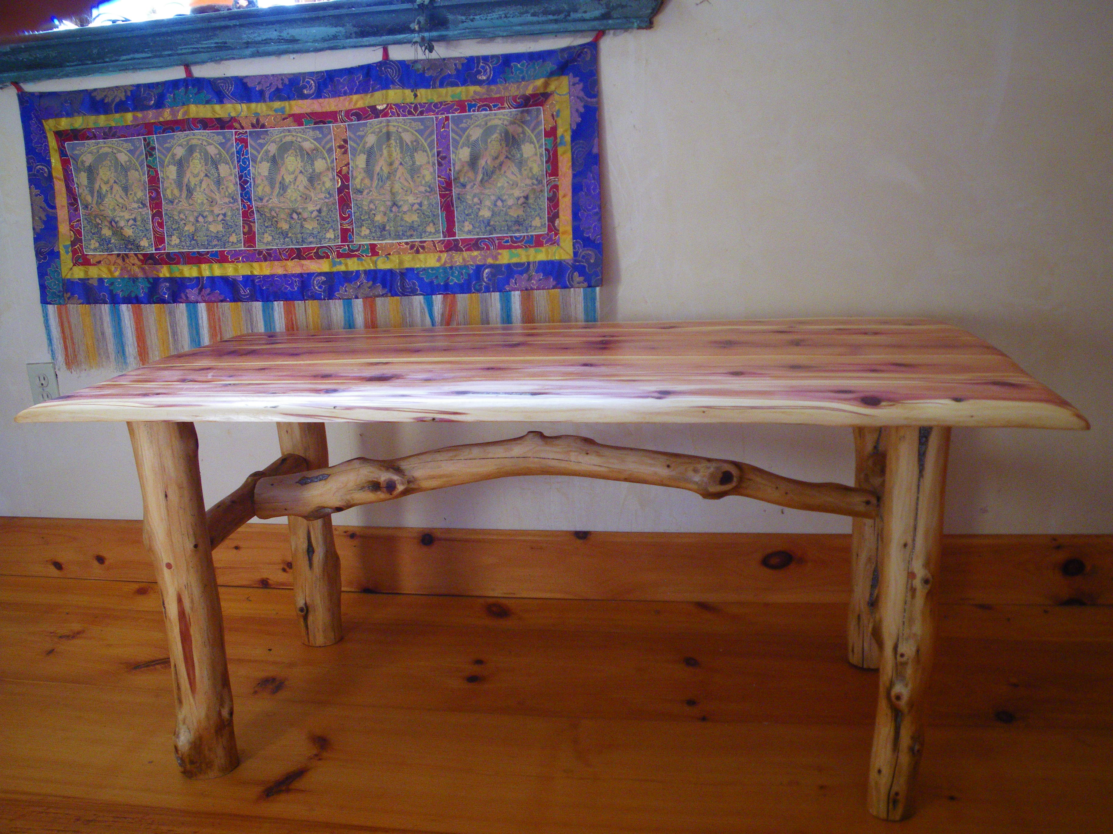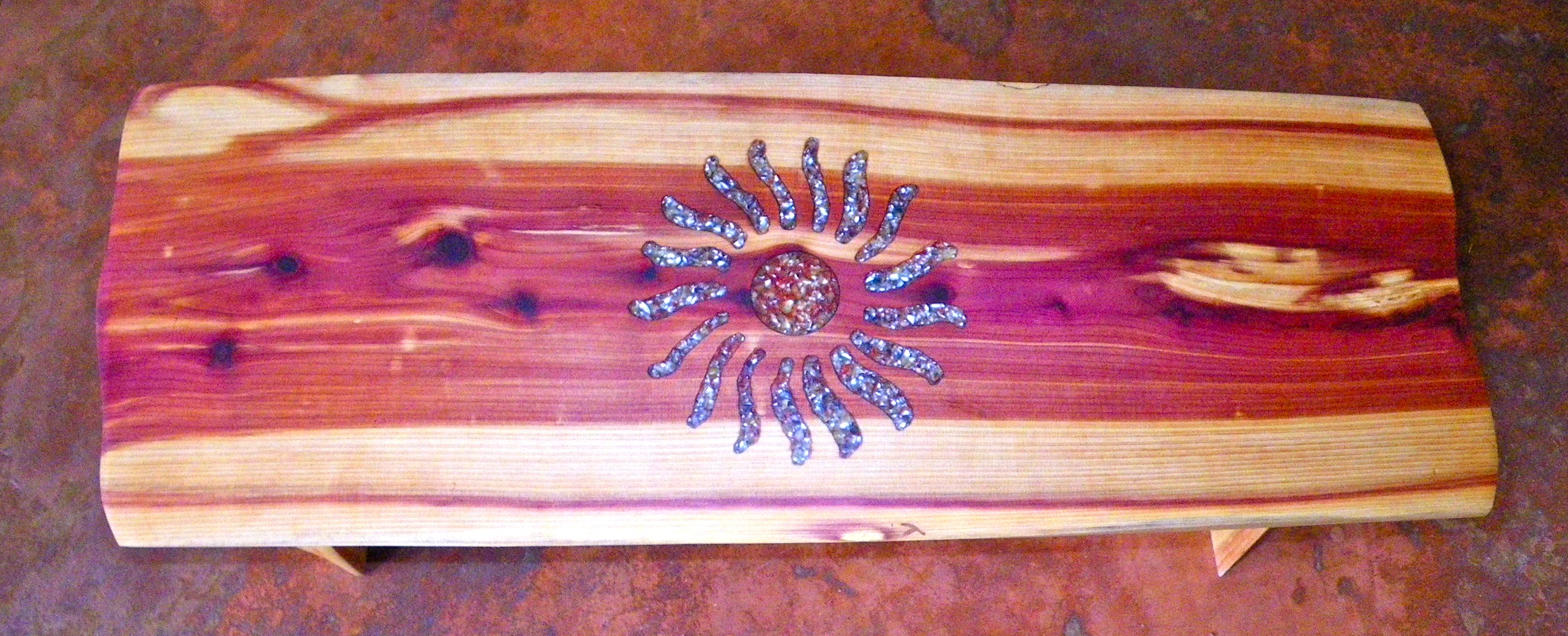 The Art: As both farmer and artist, Ricky creates beautiful, sacred rustic pieces for custom order. Pieces are made from local red cedar, harvested with love, then crafted by hand into meditation benches, altars, tables, and coat racks, with beautiful inlays of blue corn and red pepper- looks like precious stone! All done with love, in a solar powered studio on our farm.